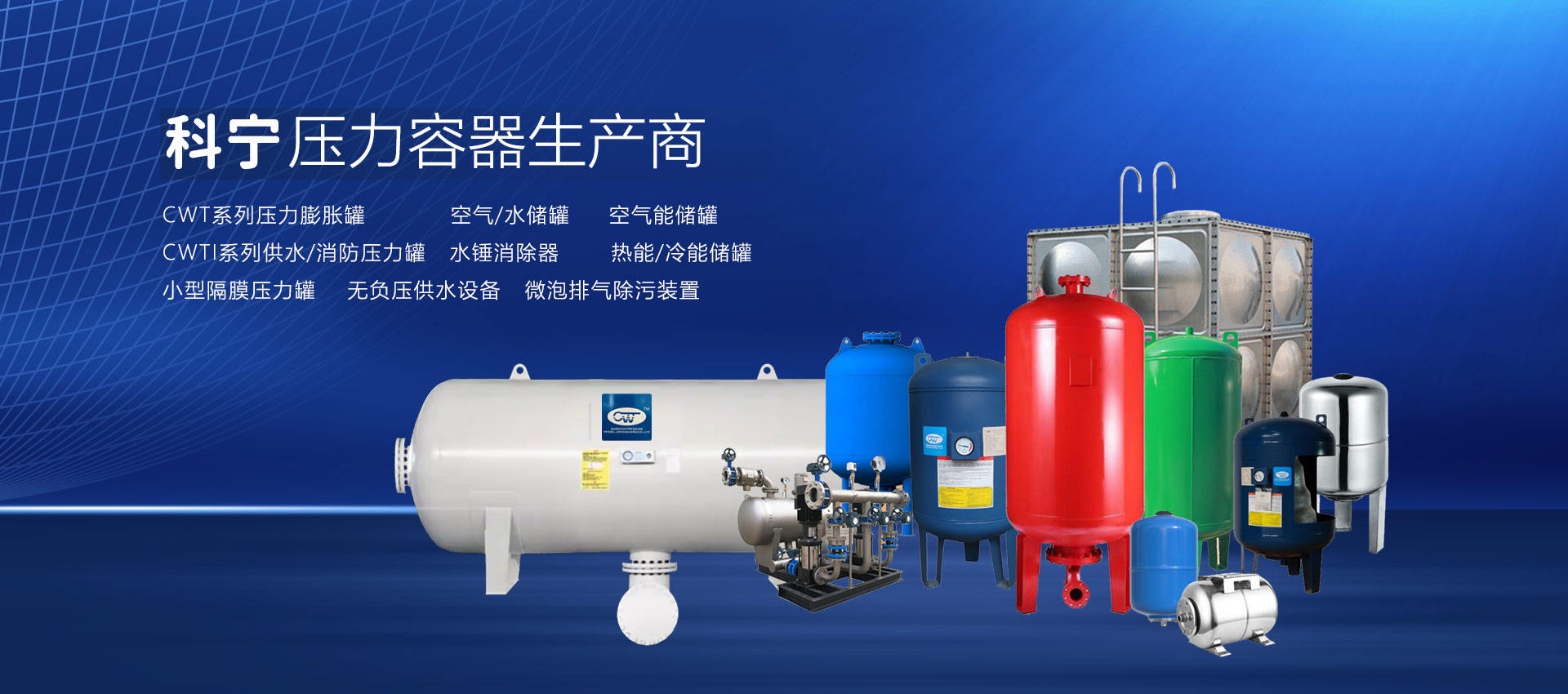查看詳情 +壽光市科寧壓力容器(壽光)有限公司是專業(yè)從事壓力膨脹罐、空氣/水儲罐、空氣能儲罐、水錘罐、熱能/冷能儲罐、無負(fù)壓供水設(shè)備穩(wěn)流罐、耦合罐的研發(fā)、制造、加工、銷售、維修;經(jīng)營國家允許范圍內(nèi)的貨物與技術(shù)的進(jìn)出口業(yè)務(wù)。材質(zhì)有碳鋼、不銹鋼、雙相鋼等。產(chǎn)品主要用于:恒壓變頻供水設(shè)備、無負(fù)壓供水設(shè)備、供暖系統(tǒng)、太陽能、地暖、消防、空氣能、空調(diào)、大型供水系統(tǒng)(防水錘)。起到節(jié)能、穩(wěn)壓、防水錘、蓄能、環(huán)保等作用,延長水泵和管道系統(tǒng)的使用壽命,確保供水系統(tǒng)穩(wěn)定運(yùn)行...